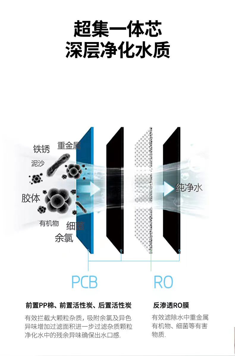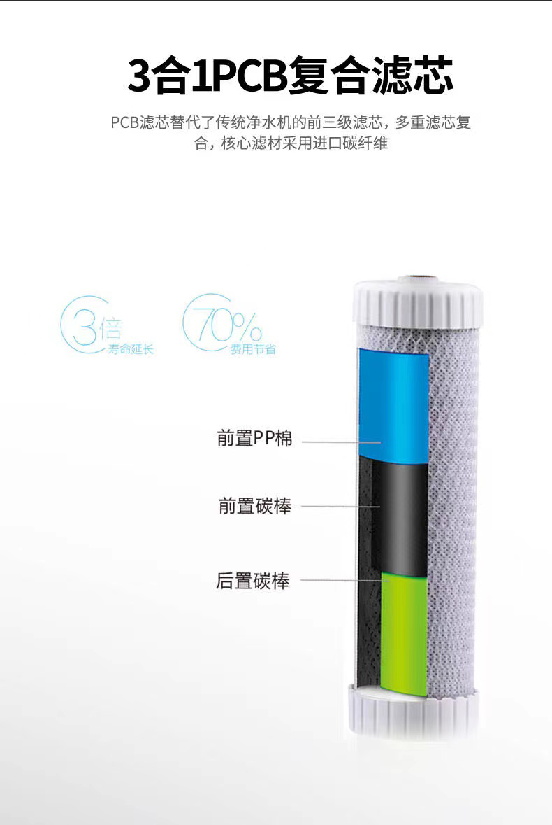 百吉凈水器A系列高端凈水器采用四級高精密度過濾,其中第一級三合一PCB復合濾芯,前置PP棉、前置碳棒、后置碳棒。百吉凈水器PCB復合濾芯替代了傳統凈水器的前三級濾芯,多重濾芯復合,核心濾材采用進口碳釬維。能有效攔截大顆粒雜質,吸附余氯及異色異味,增加過濾面積,進一步過濾雜質顆粒,凈化水中的殘余異味確保出水口感。